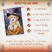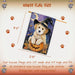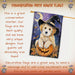 - Design Features: Goldendoodle wearing a witch hat with pumpkins and spider webs