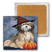 Happy Halloween Tibetan Terrier Dog Wearing Witch Hat with Pumpkin Set of 4 Natural Stone Marble Tile Coasters MCST49746