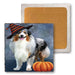 Happy Halloween Australian Shepherd Dog Wearing Witch Hat with Pumpkin Set of 4 Natural Stone Marble Tile Coasters MCST49860