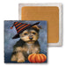 Happy Halloween Australian Terrier Dog Wearing Witch Hat with Pumpkin Set of 4 Natural Stone Marble Tile Coasters MCST49713