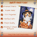 Celebrate spooky season in style with this stunning Rough Collie Halloween house flag featuring a beautiful dog surrounded by pumpkins, bats, spider webs, and a glowing full moon. This large Halloween outdoor banner adds rustic autumn charm to your porch, patio, entryway, or yard.