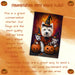 - Features a West Highland Terrier with witch hat, pumpkins, and fall accents